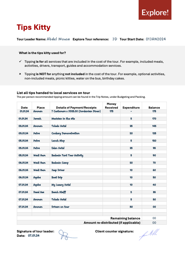 - Not all customers travelling on Explore tours have a tipping culture in their countries.