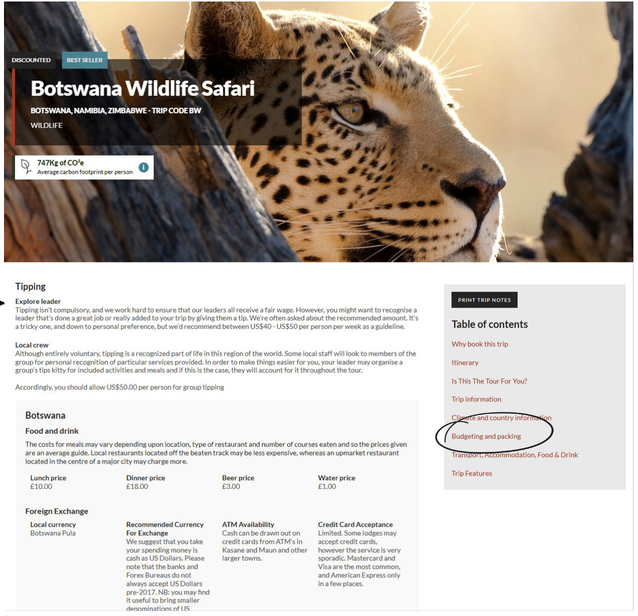 - Within the Trip Notes, under Budgeting and Packing, you will find the recommended tipping amounts for the Explore Tour Leader and Local Crew